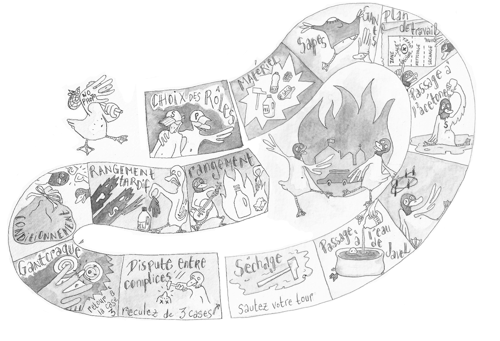 NdNTP : Patou applique de l'eau de Javel sur des objets qui n'ont jamais été contaminés, comme la bouteille en plastique utilisée dans un engin incendiaire. Mais comme Patou doit exclusivement toucher des objets propres, c'est en fait Sacha qui doit appliquer de l'eau de Javel sur des objets susceptibles d'avoir été contaminés, comme l'extérieur d'un emballage ou tout objet en métal contaminé.