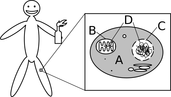 A living organism (like you) is made up of cells* (A on the following drawing), like the cells that make up your skin. These cells themselves have sub-compartments (e.g. B and C), which are specialized (in the production of energy, in the export of molecules…) One of these compartments is the nucleus* (C). Its role is to protect the cell's genetic information. The medium in which this information is stored is a molecule* called DNA (D) for deoxyribonucleic acid. Another compartment of the cell is called the mitochondrion* (B), it contains a little bit of DNA too. There are between 0 and 2000 mitochondria in a human cell.