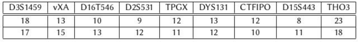 In genetic profiling, the alleles of a given number of different STRs are determined. For example, by studying different STRs numbered from 1 to 5, the number of repeats of the pattern (i.e. the allele) for each STR can be written as: