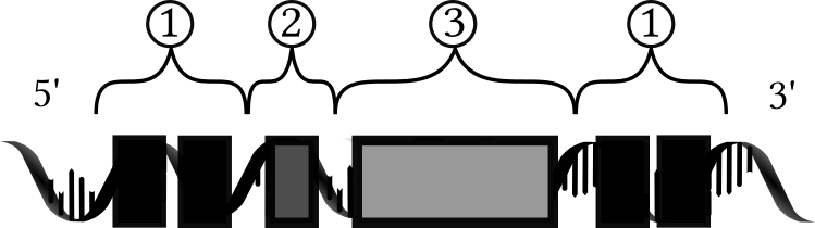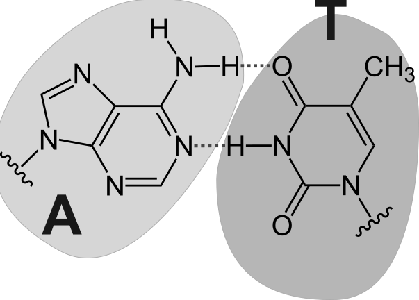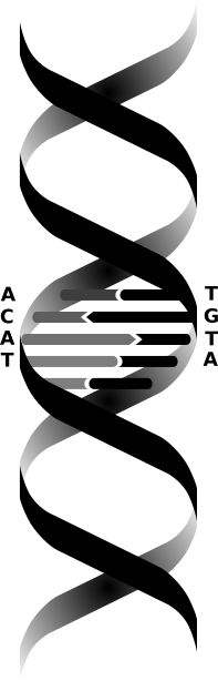 A strand of DNA is formed from four basic building blocks, the nucleotides*, called A, T, C, and G.[5] The DNA strand is formed from a succession of these building blocks: they form a DNA sequence. The length of a DNA fragment is measured in base pairs, abbreviated as bp*. To refer to a piece of DNA, we can describe its sequence, for example ATACCACAACATCACA. If this sequence codes for properties of the cell, it is called coding DNA. The rest of the DNA is called non-coding DNA.