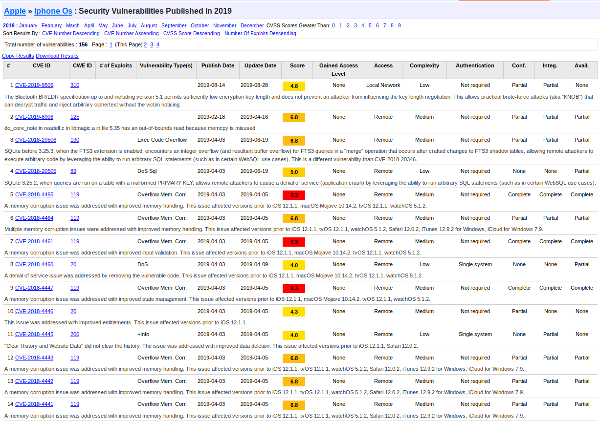 Liste des failles de sécurité concernant iOS en 2019 (toutes corrigées depuis).