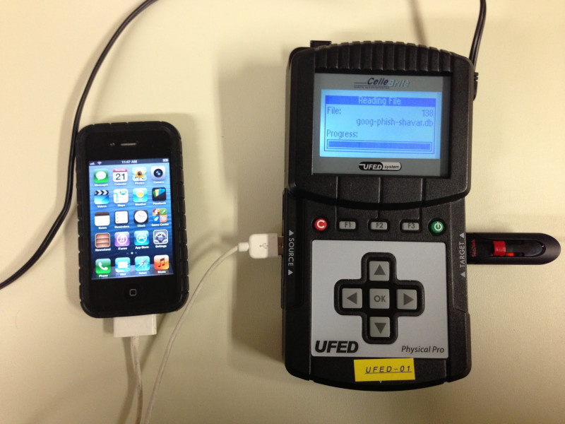 A Cellebrite Universal Forensics Extraction Device (UFED) extracting data from an iPhone 4S, 2013.